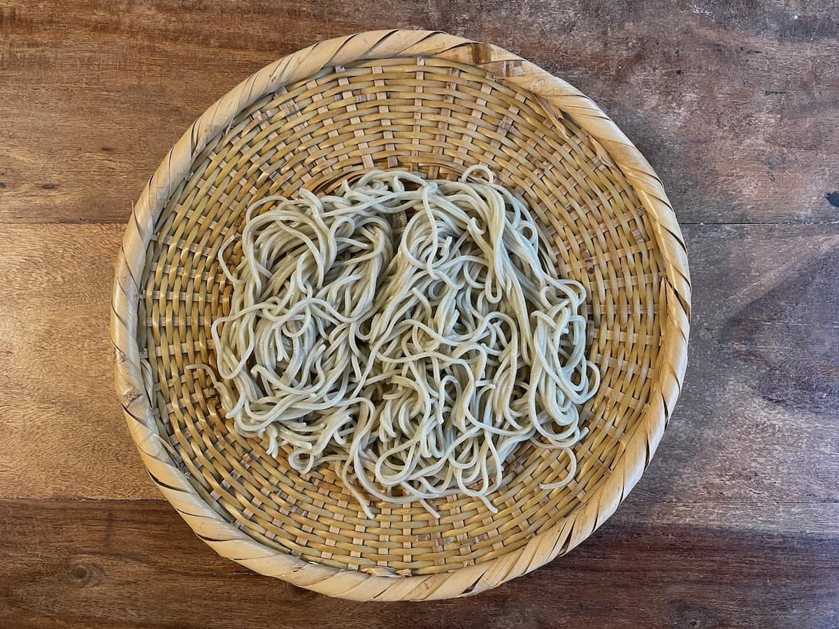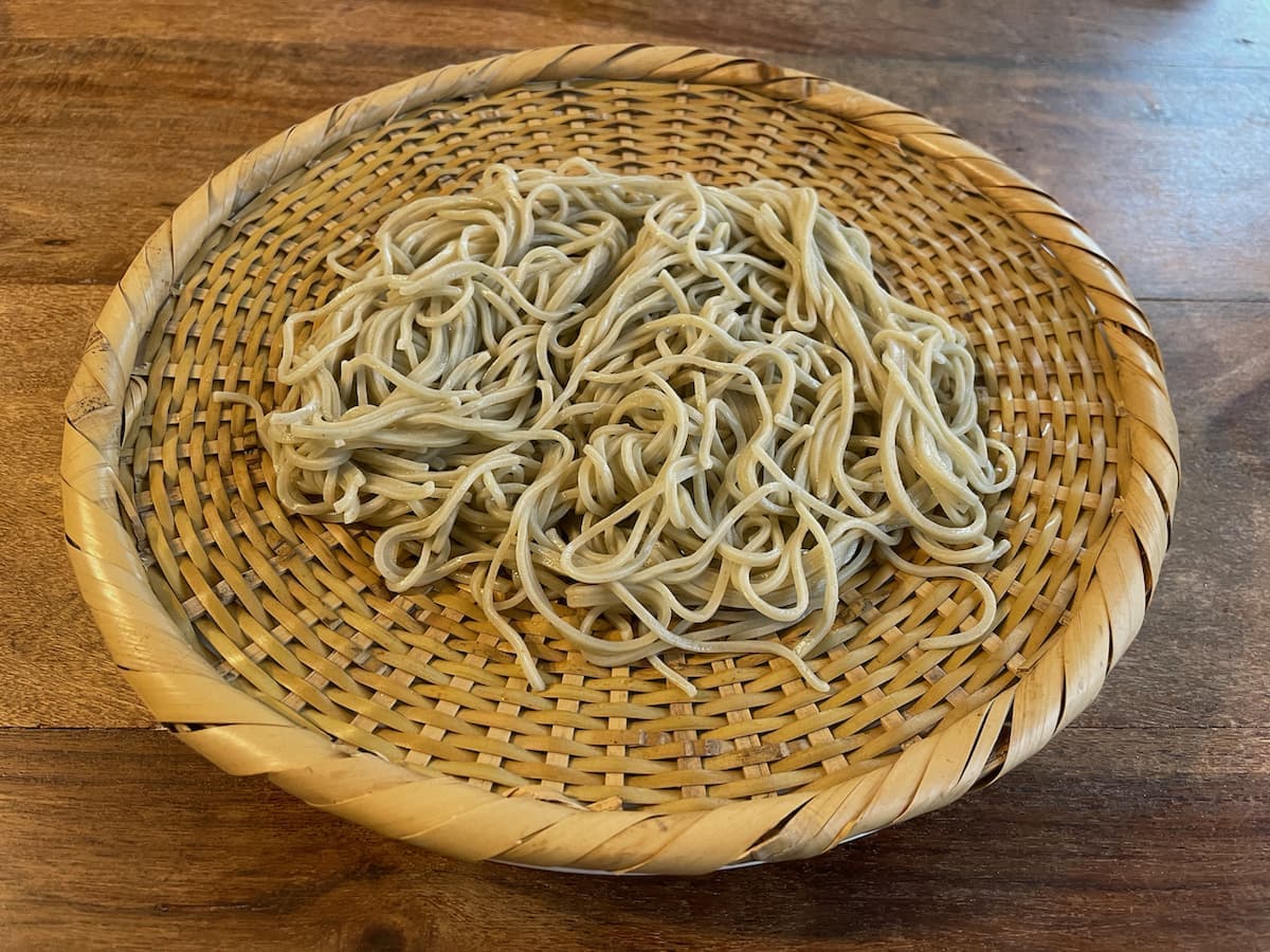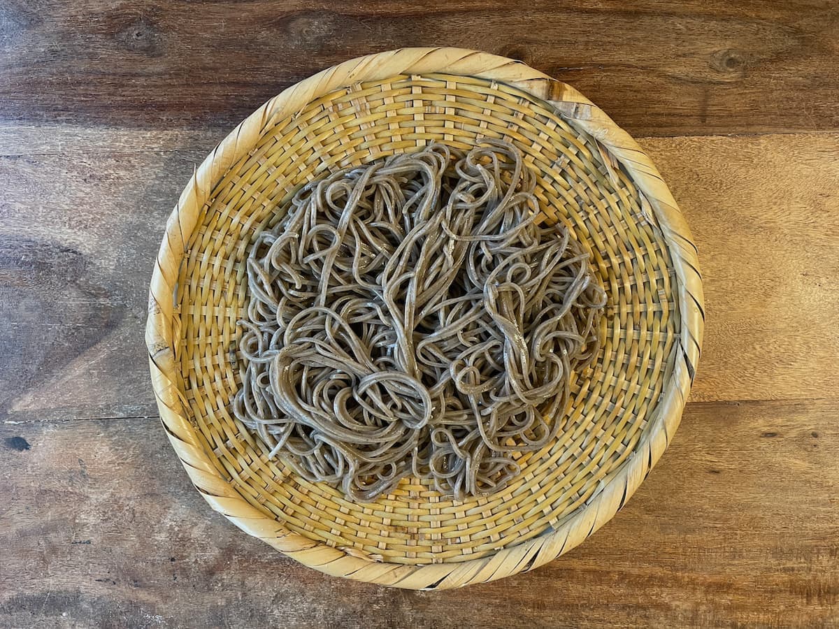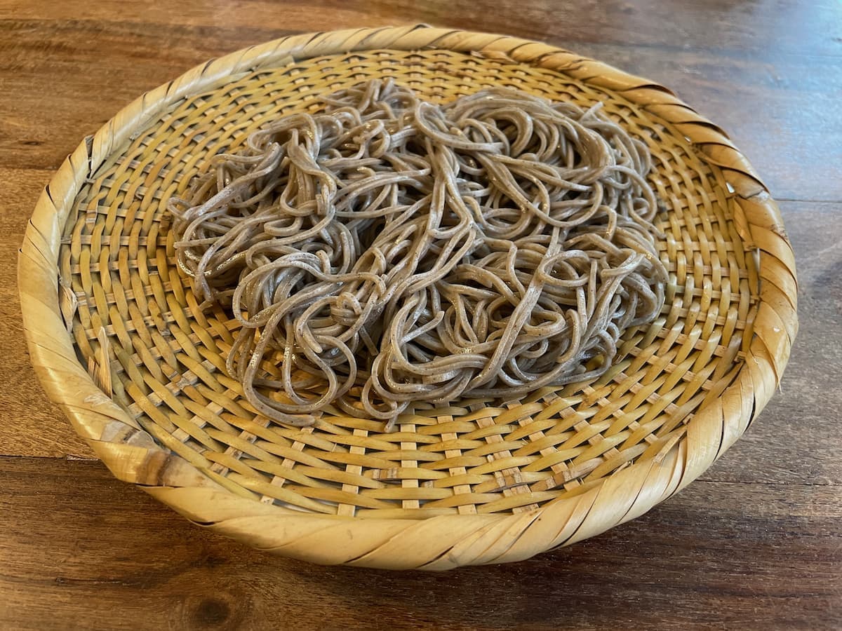 The cold buckwheat noodles served on a bamboo strainer